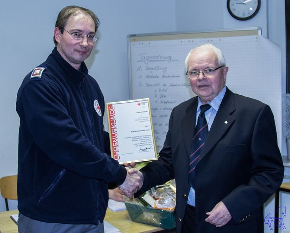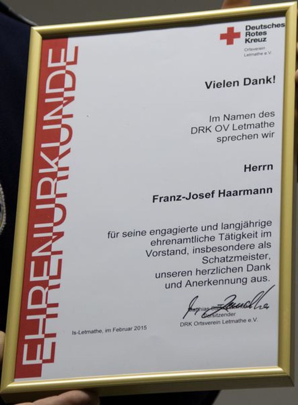 Eine besondere Ehre wurde Manfred Scheen zuteil – er ist seit 60 Jahren aktiv im DRK Letmathe, seit Mitte der 1990er auch im Vorstand als Beisitzer – die Urkunde, ausgestellt von der DRK-Präsidentin des Bundesverbandes, Gerda Hasselfeld, wurde Manfred Scheen zusammen mit der Ehrennadel vom Vizepräsidenten des Landesverbandes, Heinz Uphoff, verliehen.
