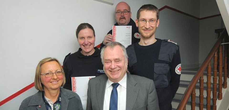 Michael Vucinaj, Vorstand des Kreisverbandes Iserlohn, Matthias Zemelka, 1. Vorsitzender des Ortsvereins Letmathe und Juliane Alfsmann, Rotkreuzleitung Letmathe, freuen sich mit Markus Weilburg - gemeinsam mit allen Rotkreuzlern.