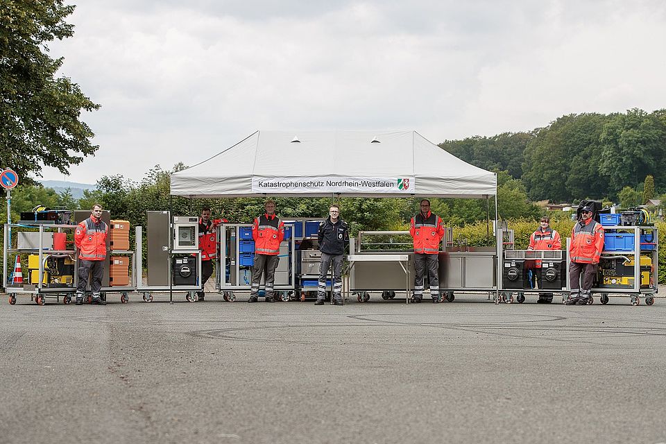 Bereits am Samstag 10. Juli wurde das Modul mit weiteren Einsatzkräften des OV Letmathe erstmals in Augenschein genommen. Die ca. 170.000€ teure Ausstattung, die komplett vom Land NRW finanziert wurde, umfasst u.a. eine Kochinsel mit drei Induktionskochfeldern und zwei Warmhalteschränken, einem Induktions-Kochkessel mit 86 Liter Inhalt, einer Ausgabetheke mit Spuckschutz und Wärmebrücke, einem Spülmodul mit Spülmaschine und großem Spülbecken, einem Transportmodul für Speisetransportbehälter, zwei Stromerzeuger mit je 17 kVA Leistung, zwei Faltzelten (6x3 m) mit Beleuchtung. Das gesamte Material wurde auf dem, ebenfalls im Jahr 2020 neu ausgelieferten LKW des Typs Mercedes Benz Atego 918L mit Schwenkwand und Ladebordwand, (ebenfalls vom Land NRW finanziert), verlastet.