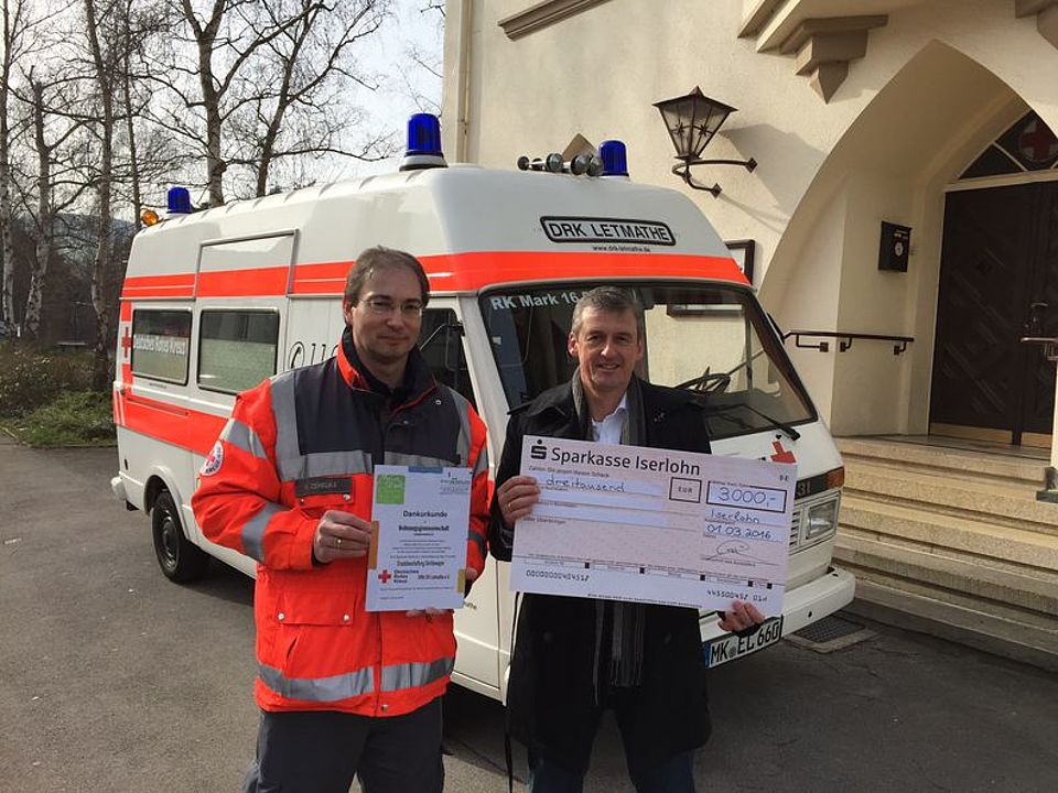 Die Wohnungsgenossenschaft Letmathe Oestrich eG überreichte dem 1. Vorsitzenden, Matthias Stefan Zemelka, am 01.03.2016 eine Spende in Höhe von 3000 Euro für die Ersatzbeschaffung des betagten Letmather Gerätewagens. Den symbolischen Scheck übergab der Geschäftsführer der Wohnungsgenossenschaft Letmathe Oestrich eG Jochen Eikermann - er "entdeckte" unser Projekt "Neuer Gerätewagen" auf der Seite "Meine Stadt - darum geb' ich was".