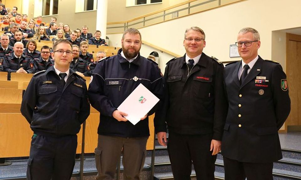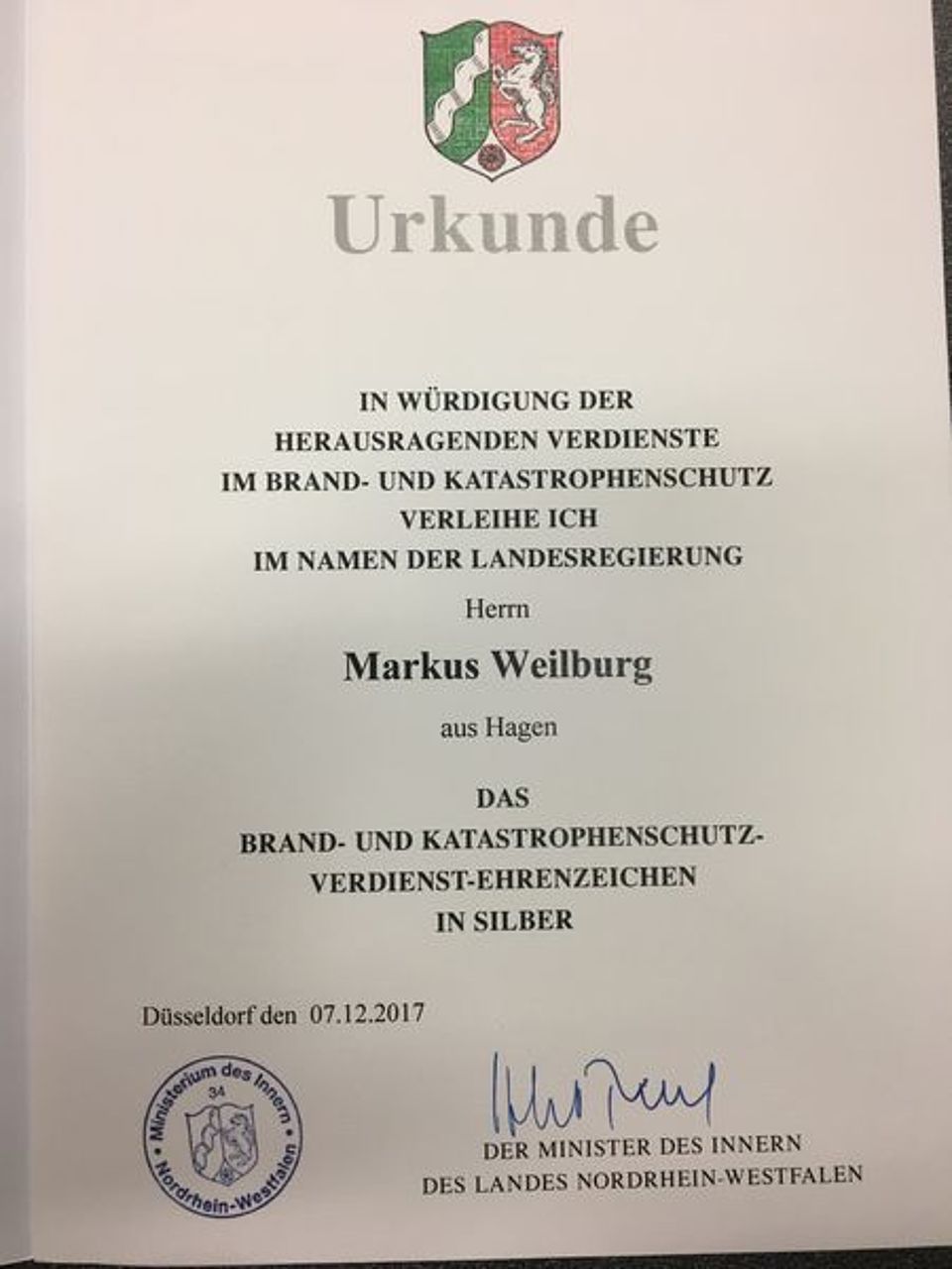 Am Samstag 27.01.2018 wurde Markus Weilburg im Rahmen der Jahresdienstbesprechung der Feuerwehr Iserlohn für besondere Verdienste geehrt. Markus Weilburg wurde das "Brand- und Katastrophenschutz-Verdienst-Ehrenzeichen in silber" des Ministers des Innern des Landes Nordrhein-Westfalen verliehen - verlesen und überreicht durch den Dezernenten für Feuer- und Katastrophenschutz der Bezirksregierung Arnsberg, Thorsten Meyer.