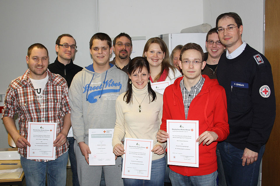 Besonderes Augenmerk wurde auf einen Einsatz am 17. und 18. August in Unna gerichtet. Damals war man kurzfristig durch einen Anruf aus der Landesgeschäftsstelle gebeten worden, die dortige Flüchtlingshilfe zu unterstützen. Damals, so der stellvertretende Kreisrotkreuzleiter Markus Weilburg, kamen beispielsweise viele Flüchtlinge aus Syrien in Unna an. Weilburg dankte auch den Arbeitgebern, die ihre Mitarbeiter für den DRK-Dienst freigestellt hatten. Und die Teilnehmer am Einsatz in Unna erhielten am Freitag Urkunden: Sebastian Lotz, Daniel Hein, Cara Lange, Juliane Alfsmann, Ann-Kathrin Hönl, Lena Gertischke, Niklas Sander, David Lux, Mark-Philippe Hohmann, Felix Fricke und Robin Friedrichs. Cara Lange, Sebastian Lotz, David Lux, Marvin Wessels und Mark-Philippe Hohmann erhielten zudem ihren Landesnachweis. David Lux und Dennis Tischmeyer wurden zum Führungshelfer ernannt, außerdem Marvin Wessels zum Verpflegungshelfer.